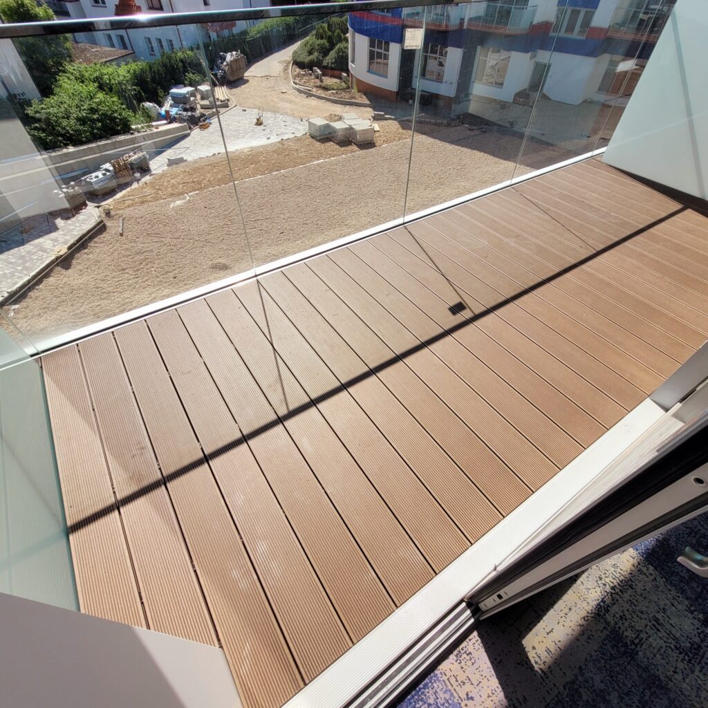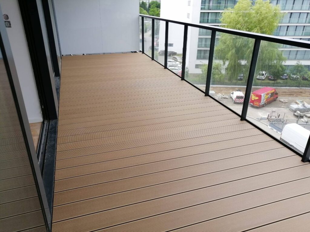 Taras kompozytowy na wylewce betonowej: Klasyczne rozwiązanie na solidną płytę betonową ze spadkiem. System oparty na legarze kompozytowym, poziomowanym na klinach lub niższych wspornikach. Stosowany także na balkonach i loggiach.