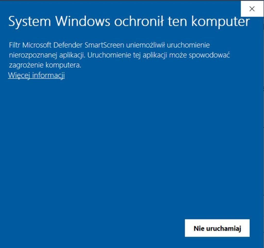 - Jeśli pojawi się okno systemowe Windowsa to należy kliknąć Więcej informacji i Uruchom mimo to
