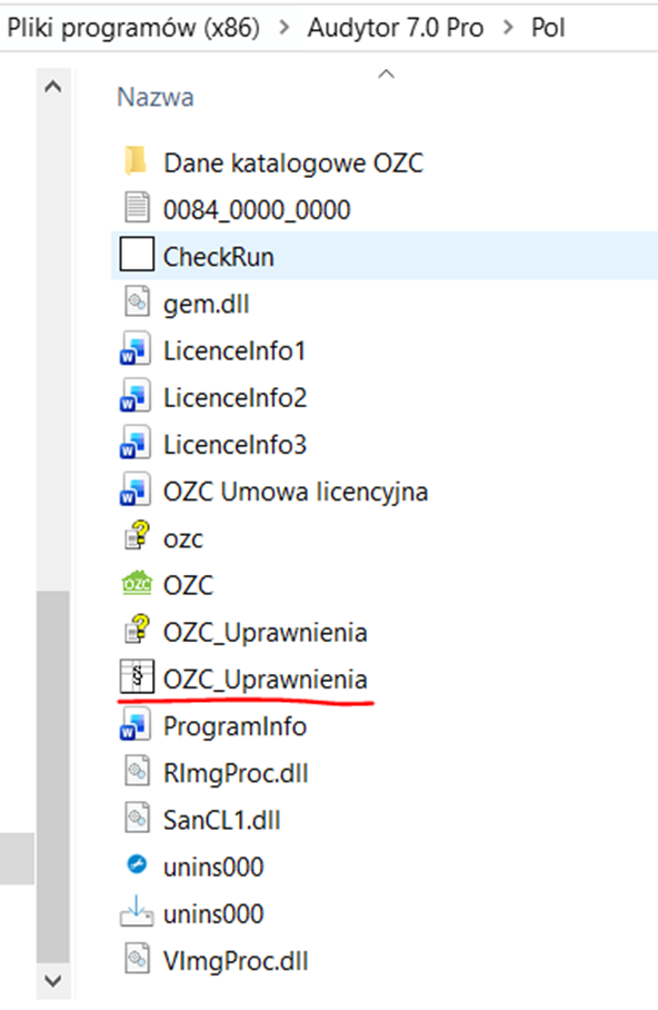 - W katalogu tym należy odnaleźć plik uprawnienia.exe z ikoną paragrafu na białym tle. Plik ten instaluje się wraz z instalacją programu.