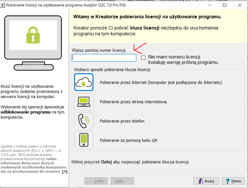 - Na ikonce uprawnienia należy kliknąć prawym przyciskiem myszy i wybrać opcję Uruchom jako administrator – program zostanie uruchomiony w trybie pobierania licencji. Proszę skorzystać z opcji pobierania licencji przez internet i wpisać swój numer licencyjny. Twój klucz licencyjny wyślemy osobnym mailem w przyszłym tygodniu