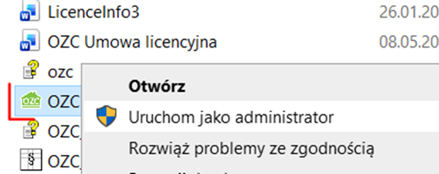 - Po pomyślnym pobraniu klucza należy kliknąć na ikonkę danego programu i Uruchomić go jako administrator. Np.: