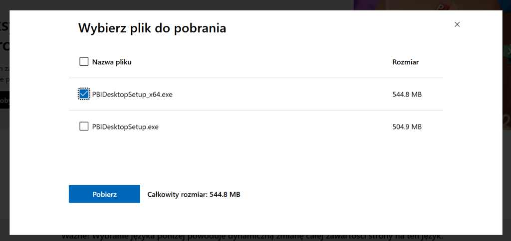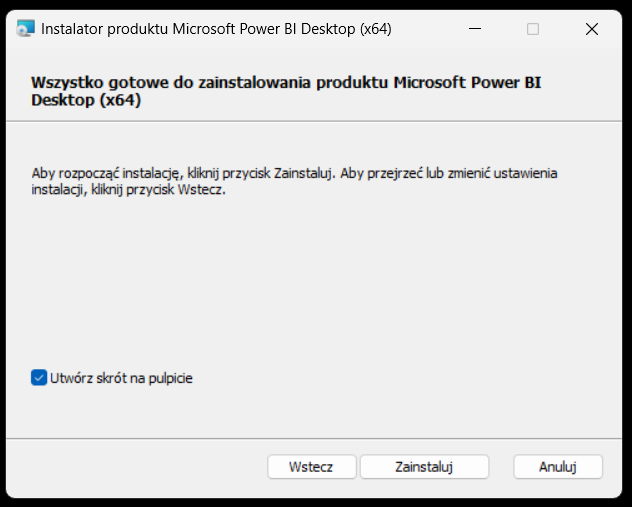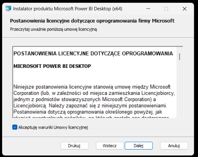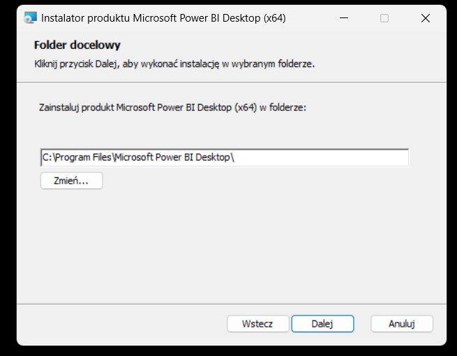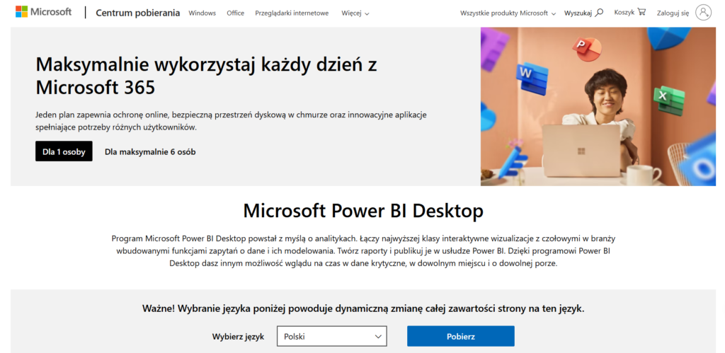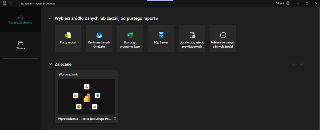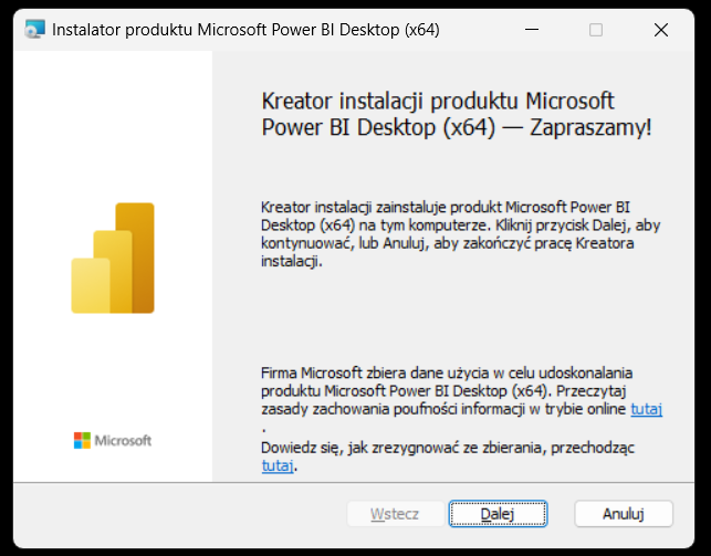 Warsztat wykonany zostanie w polskiej wersji programu Power BI Desktop. Wersja web różni się sposobem rozpoczynania pracy i nie pokrywa się z przygotowanym warsztatem. Program jest darmowy i do warsztatu nie jest wymagane stworzenie konta. Zalecane jest testowe otwarcie programu przed warsztatem.