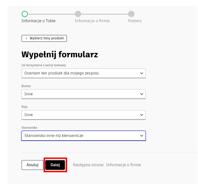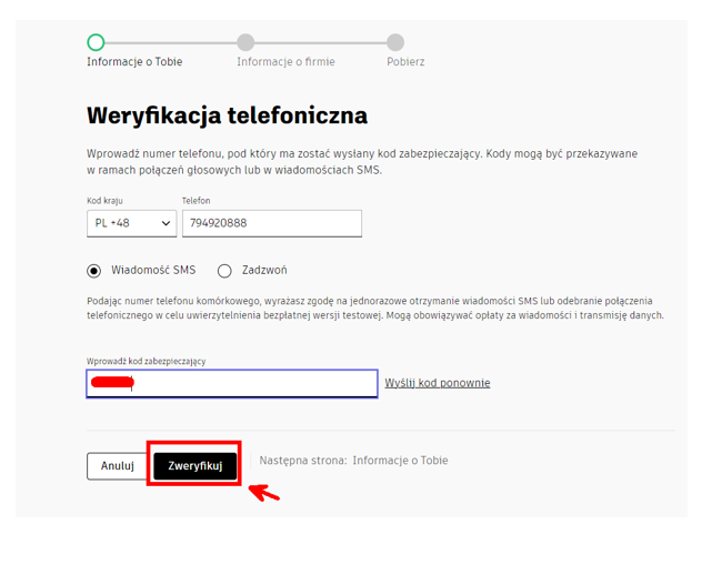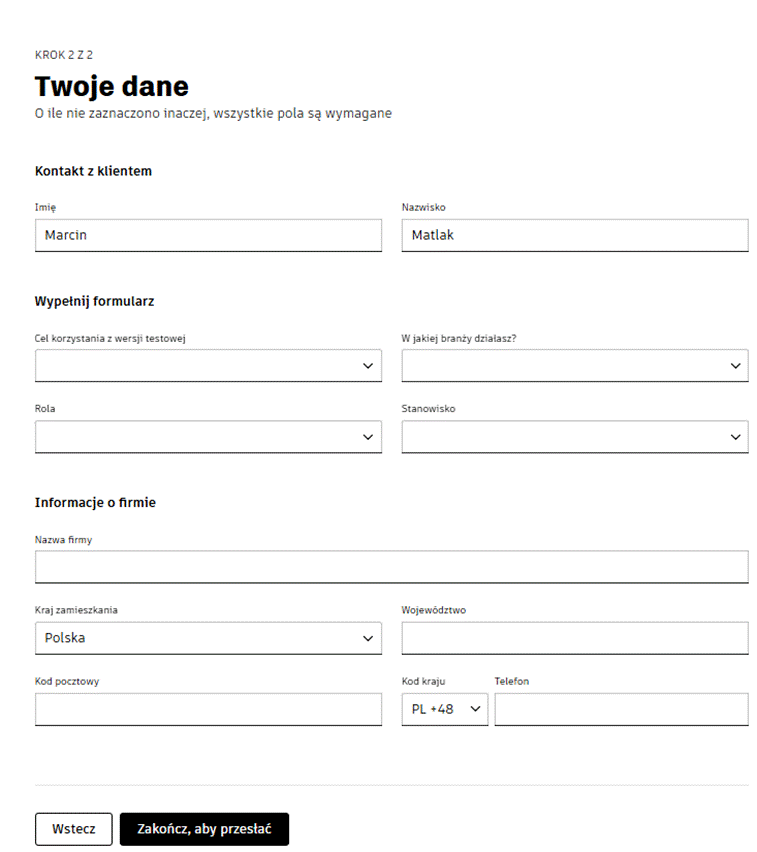 2. Zostaniemy przeniesieni na stronę, gdzie należy uzupełnić formularz. Poniżej kolejne kroki i przykładowe dane: