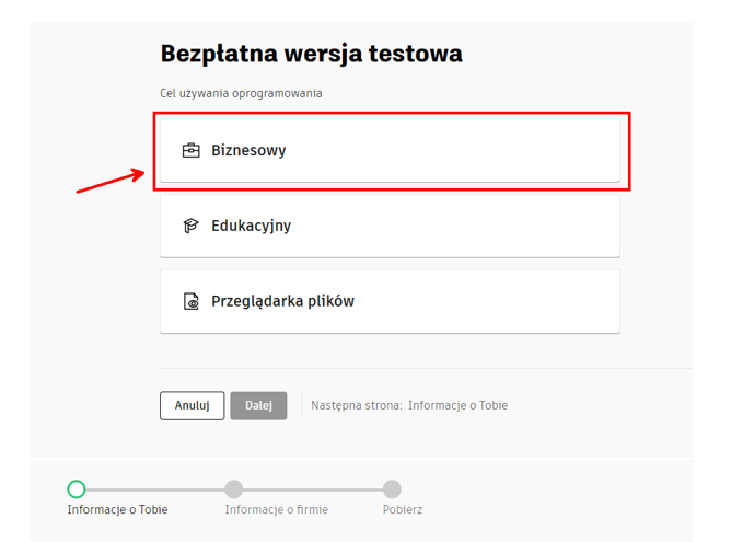W kolejnym kroku musimy wybrać jedną z opcji (np. rozpoczynamy pobieranie, po chwili można je anulować), aby przejść do ostatniego okna (okres testowy właśnie się rozpoczął).