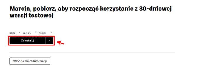 Klikamy zainstaluj (program jest już zainstalowany, ale konieczne jest kliknięcie, aby rozpocząć okres testowy) :