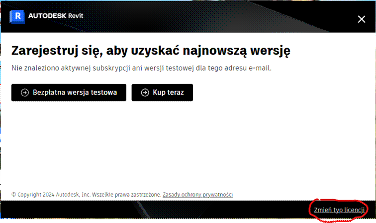 W przypadku problemów z aktywacja wersji trial Revita (puste okno po kliknięciu opcji Bezpłatna wersja testowa) należy aktywować wersję trial według poniższej instrukcji: